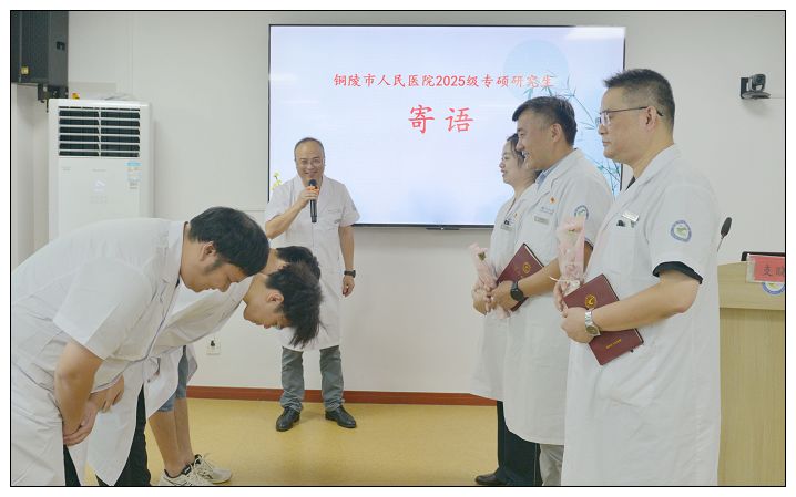 新生代表韩宇翔同学在发言中,表达了对即将开始的住培生涯的憧憬与决心。她代表新生郑重宣誓,将在未来的三年住培时光里,将恪守医德、尊师重道、刻苦钻研、勤学不辍,严格遵守住培大纲要求,努力完成从医学生到临床医师的蜕变,绝不辜负导师的殷切期望和医院的精心培养。