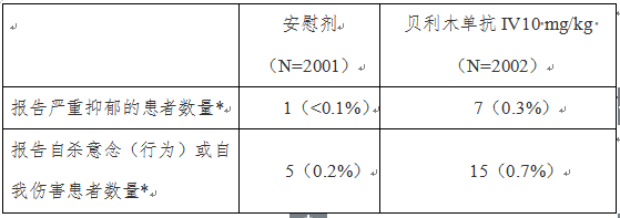 ? 包括一项随机临床试验在内的临床试验初步结果显示,接受贝利木单抗治疗的患者有增加严重精神不良事件(抑郁、自杀意念/行为[包括由自杀导致的死亡]、或自我伤害)风险。