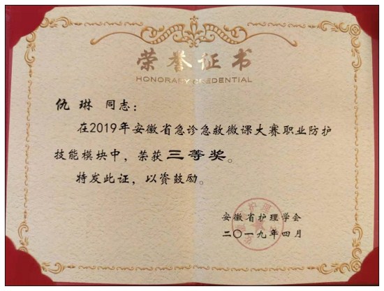 为提高急诊急救护理教学培训效果,充分运用信息技术与急诊急救护理教学培训有机结合,安徽省护理学会急诊急救护理专业委员会主办了2019年安徽省“急诊急救微课”大赛。由我院护理部指导,急诊科护理人员陶玲云、张江生、仇琳自行录制的两份微课作品《急诊醉酒患者暴力行为的风险管理》及《急诊针刺伤的防护》分别荣获大赛二、三等奖。颁奖典礼于6月29日在中国科学技术大学附属第一医院安徽省立医院进行。