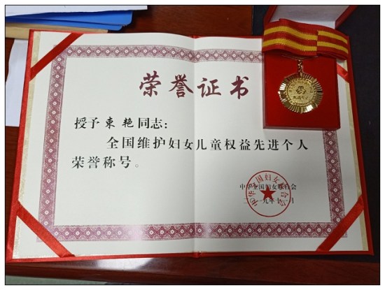 日前,全国妇联表彰了一批全国维护妇女儿童权益先进集体和先进个人,我院束艳同志获得“全国维护妇女儿童权益先进个人”荣誉称号。