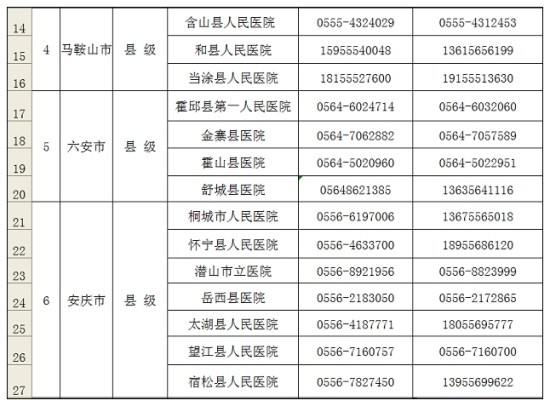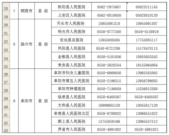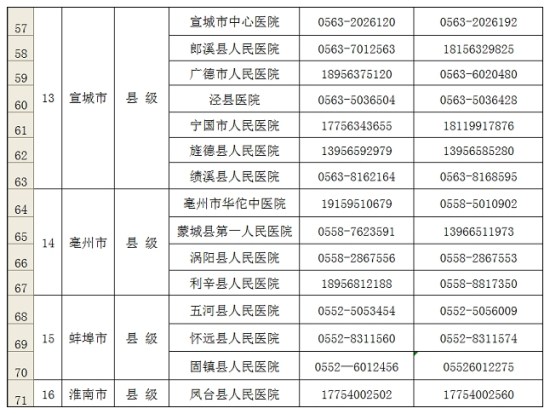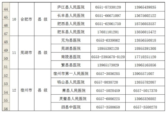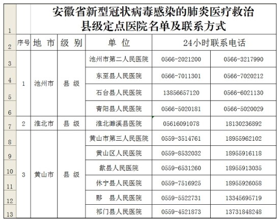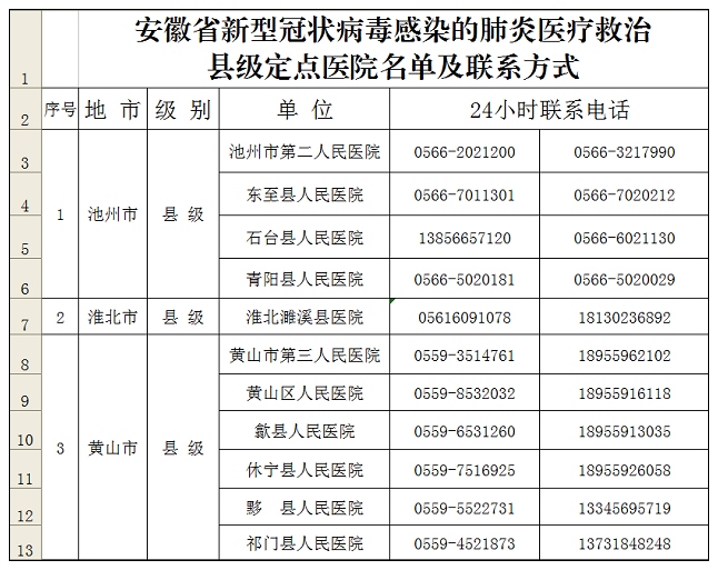 安徽省新型冠状病毒感染的肺炎医疗救治县级定点医院名单及联系方式