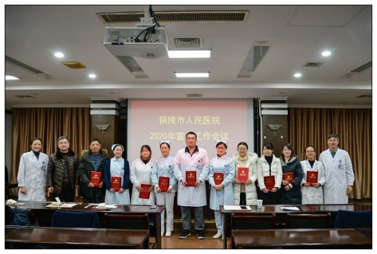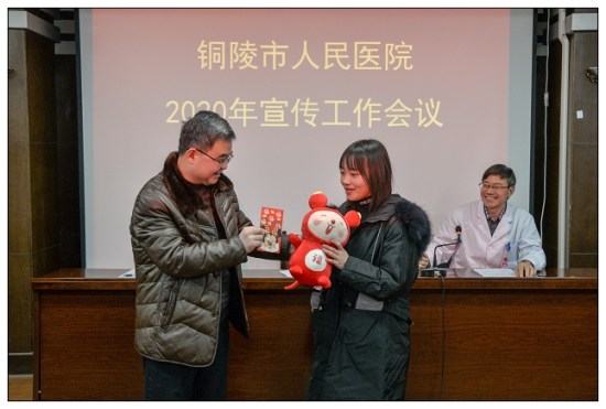 会上,对铜陵市人民医院2019年度10名优秀宣传报道员进行表彰、颁发荣誉证书,他们分别是朱娟娟、付睿杰、陆爽、周方杰、江霞、徐江、金泽秀、陶玲云、杨华、俞亮珍。院党委书记、院长戴晏还亲自为医院微信公众号“特别关注奖”获得者神经外科王晶颁奖,鼓励大家持续关注医院的微信公众号。