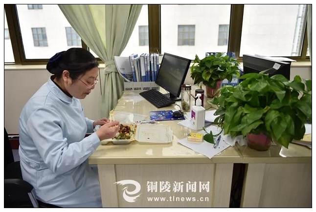 临近下午2时,殷佩芬才吃上饭,在冬日的寒风中饭菜早已凉了。她说这几天都是早晨8时上班,下午5时才能下班,遇到特殊情况时,她和同事们晚上还要加班。因为长时间满负荷的工作,殷佩芬显得有些憔悴,但她依然笑着告诉记者:“自己是一名护士,这些都是自己应该做的,在这样一个关键时刻,我们义无反顾。”(《铜陵新闻网》2020年1月28日)