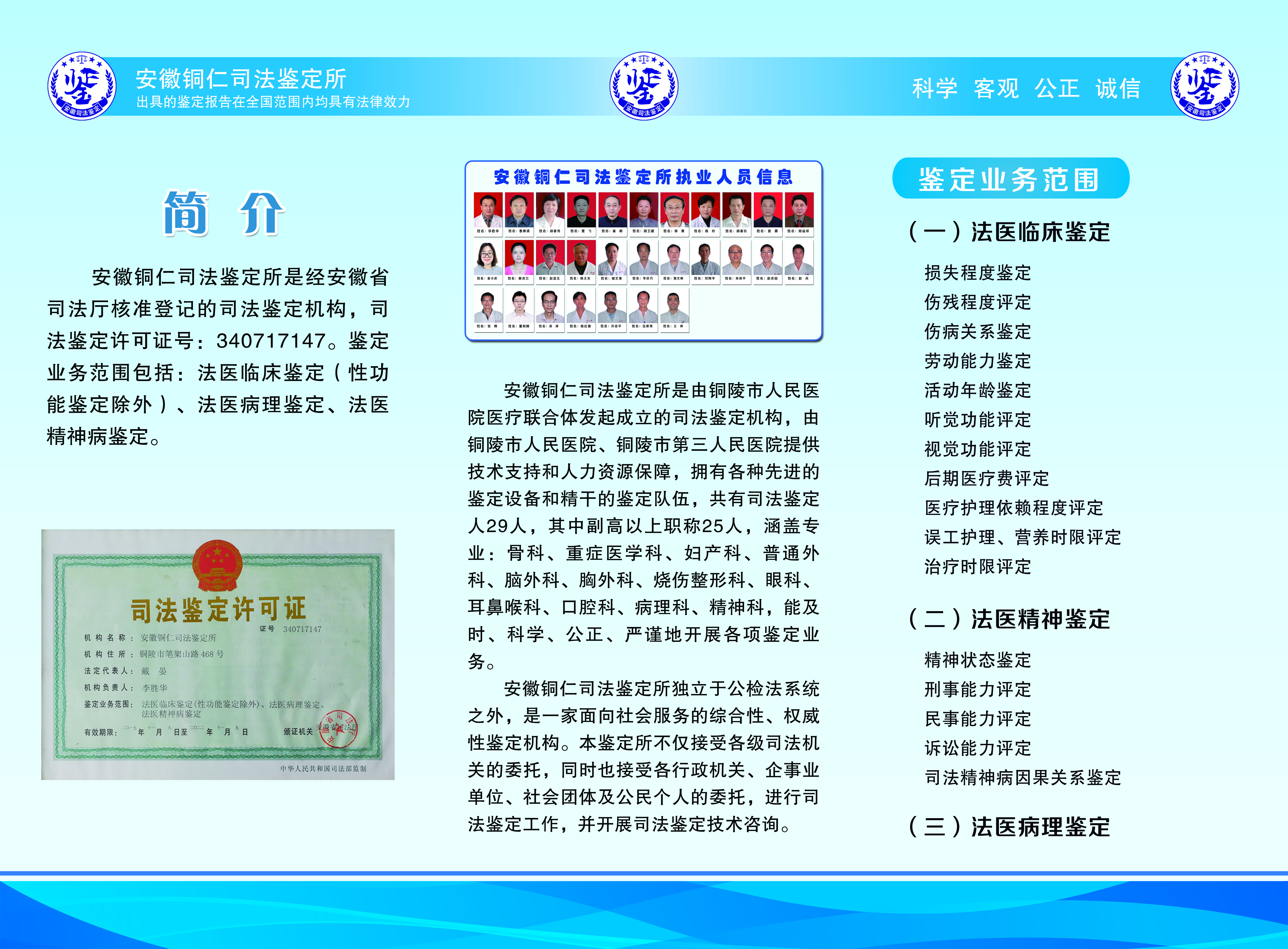安徽铜仁司法鉴定所是由铜陵市人民医院医疗联合体发起成立的司法鉴定机构,由铜陵市人民医院、铜陵市第三人民医院提供技术支持和人力资源保障,拥有各种先进的鉴定设备和精干的鉴定队伍,共有司法鉴定人29人,其中副高以上职称25人,能及时、科学、公正、严谨地开展各项鉴定业务。